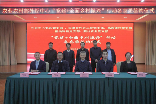 在充分沟通调研的基础上,11月24日,外经中心第四党支部与天津市人民政府合作交流办公室支援合作三处党支部、甘肃省庆阳市华池县南梁镇荔园堡村党支部、天津圣纳科技有限公司党支部、甄优(天津)农业科技发展有限公司党支部共同签署“党建+全面推进乡村振兴”行动备忘录。外经中心党委书记郭立彬、天津合作办党组负责人王东、甘肃省庆阳市华池县县委书记张小强、天津市东西部协作和支援合作产业促进会执行主席刘树明等相关支部党员代表30余人出席备忘录签约仪式。