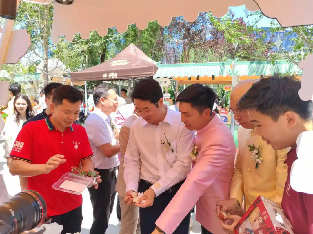 The China-Thailand fruit pop-up market was held simultaneously, showcasing characteristic fruits and products from both countries, including durians, peaches, coconuts, lychees, watermelons and mangosteens.