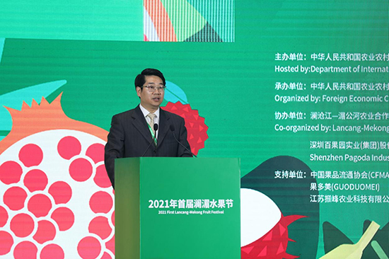 农业农村部国际合作司副司长韦正林在致辞中指出,澜湄六国共饮一江水,亲如一家人,是事实上的命运共同体。在各方共同努力下,五年来,澜湄农业合作在政策对话、产业发展、农产品贸易与投资、能力建设与知识分享等方面取得积极进展,为次区域农业绿色发展、农民增收、农村繁荣做出了贡献。水果是澜湄地区重要农产品和主要贸易品类,本次澜湄水果节就是要践行“发展为先、务实高效”的澜湄合作宗旨,共享发展机遇,推动次区域水果等各农业产业合作不断深化,促进互利共赢。他建议,成员国继续发扬接地气、惠民生、重参与的澜湄农业合作特色,不断深化农业科技经贸合作、能力建设、绿色发展等领域合作,提升澜湄农业合作水平。